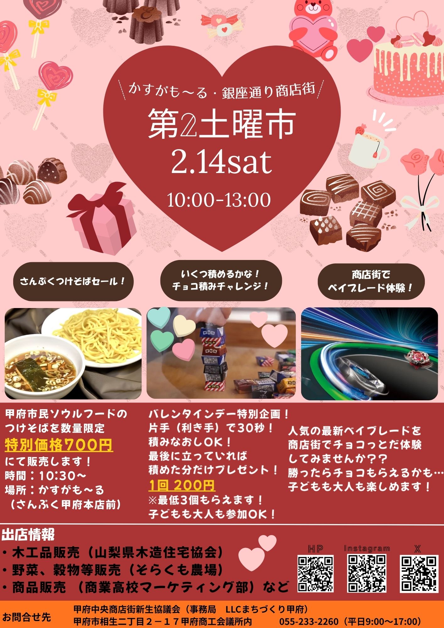 開催日2/14はなんとバレンタインデー当日!商店街でチョコっとお得な催し物を実施します。寒い日が続きますが楽しい企画をたくさん用意して、皆さまのお越しをお待ちしております。